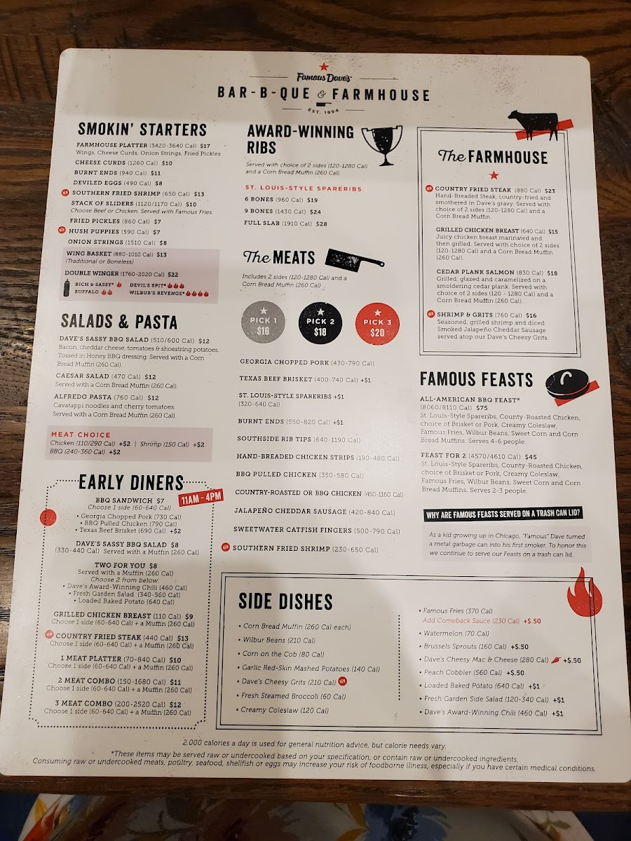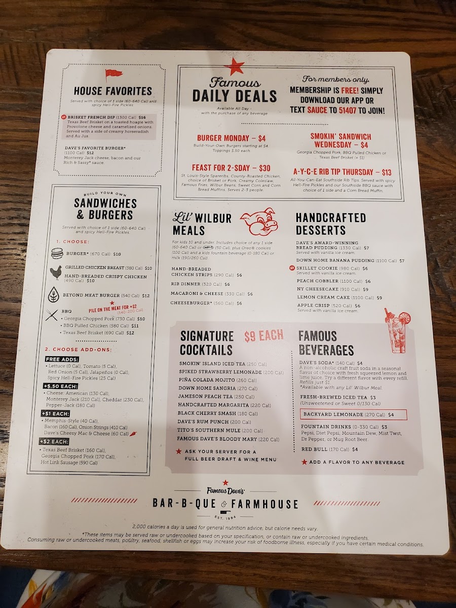 Introducing the menu at Famous Dave's Bar-B-Que - Chandler, diners can expect an impressive selection of mouth-watering barbecue delights. Located in the heart of Chandler, this renowned eatery offers signature dishes perfect for casual meals or special occasions.
